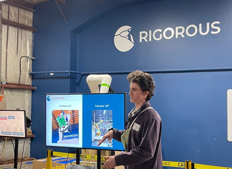 I recieved the opportunity to talk at the Burlington Hardware Meetup. Rigourous was the host and I talked about our vision system. How we pick out a box from the end of the line and adjust the robot motion in real time.